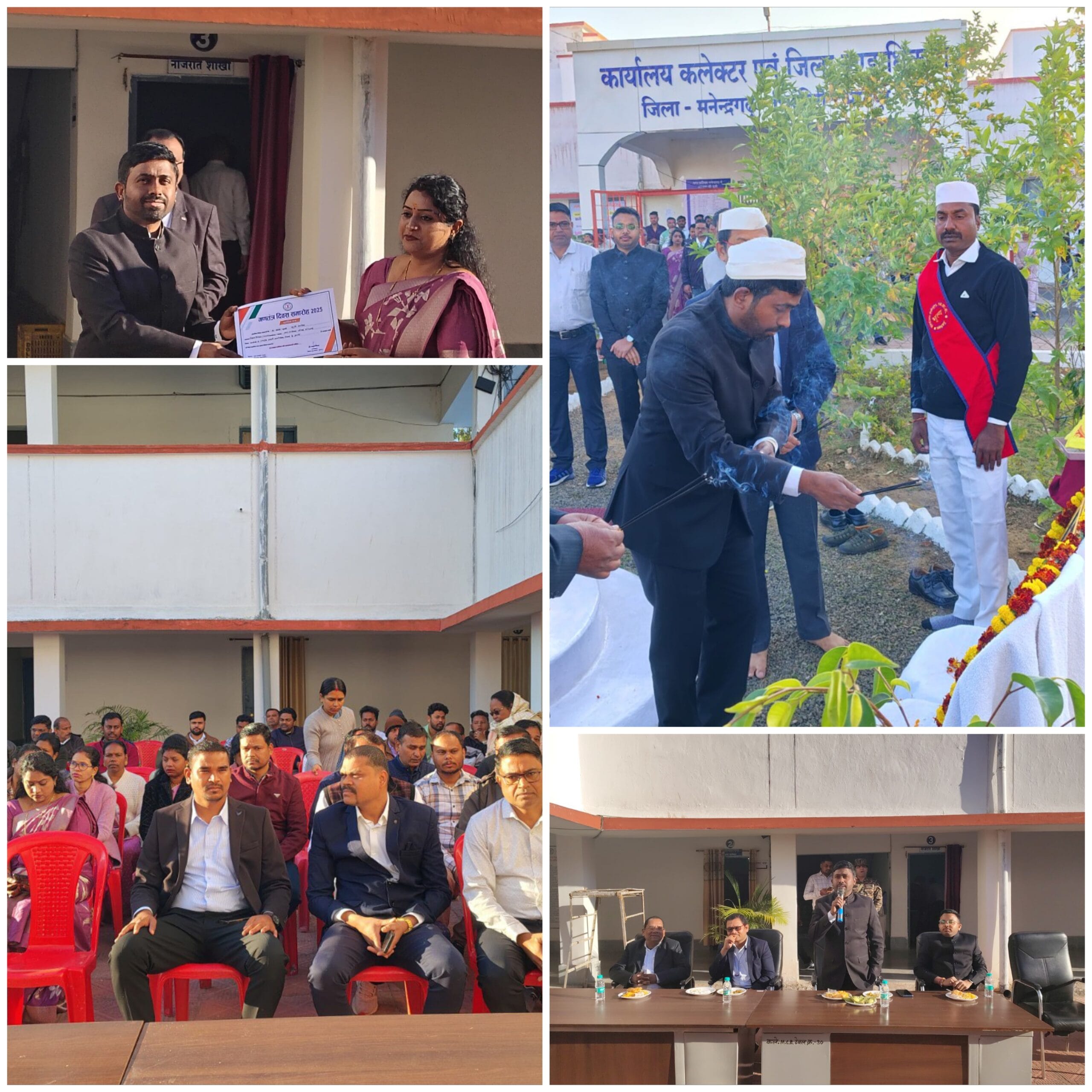एमसीबी/ कलेक्टर डी. राहुल वेंकट ने 76वाँ गणतंत्र दिवस के अवसर पर कलेक्ट्रेट परिसर में राष्ट्रीय ध्वज फहराया तथा सामूहिक रूप से राष्ट्रगान किया। उन्होंने महात्मा गांधी की छायाचित्र और परिसर में स्थापित छत्तीसगढ़ महतारी की प्रतिमा और उनकी छायाचित्र पर माल्यार्पण कर उन्हें पुष्प अर्पित किया। इस अवसर पर कलेक्टर ने उपस्थित सभी लोगों को गणतंत्र दिवस की बधाई और शुभकामनाएं देते हुए कहा कि यह दिन हमें संविधान के आदर्शों और मूल्यों को याद करने और उन्हें अपने जीवन में उतारने की प्रेरणा देता है। यह अवसर हमें देश के विकास और उन्नति में अपना योगदान देने का संकल्प लेने के लिए प्रेरित करता है। इस गणतंत्र दिवस के अवसर पर कलेक्टर ने उत्कृष्ट कार्य करने वाले अधिकारियों और कर्मचारियों को सम्मानित किया। उन्होंने सभी से ईमानदारी और समर्पण के साथ कार्य करते रहने की अपील की। इस अवसर पर अपर कलेक्टर अनिल कुमार सिदार, संयुक्त कलेक्टर सी.एस. पैकरा और डिप्टी कलेक्टर प्रीतेश कुमार सिंह राजपूत सहित कलेक्ट्रेट परिसर के सभी अधिकरी-कर्मचारीगण उपस्थित थे।