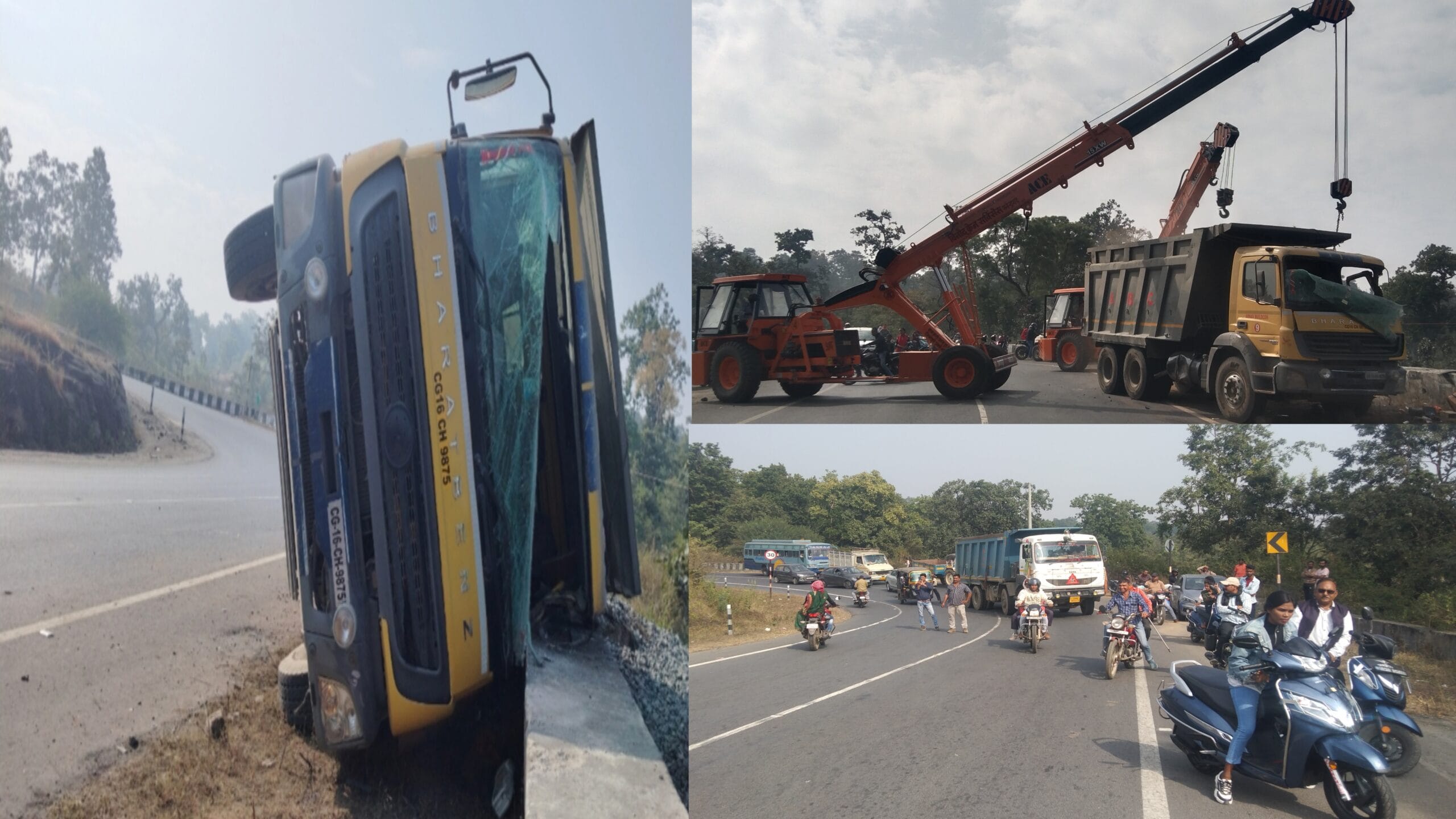 मनेंद्रगढ़। जिला मुख्यालय मनेंद्रगढ़ सिद्ध बाबा घाट के नीचे नेशनल हाईवे क्रमांक 43 पर सोमवार की सुबह लगभग साढ़े पांच बजे गिट्टी से लोड हाईवा अनियंत्रित होकर पलट गई। जिसमें किसी भी प्रकार की जान-माल की हानि नहीं हुई। सिद्ध बाबा घाट के नीचे नेशनल हाईवे क्रमांक 43 पर गिट्टी से भरी हुई वाहन क्रमांक CG 16 CH 9875 हाईव मध्यप्रदेश बिजुरी की ओर से छत्तीसगढ़ मनेद्रगढ़ की ओर आ रही थी। वाहन को क्रेन की मदद से सुबह लगभग 11 बजे उठाया गया इस दौरान नेशनल हाईवे क्रमांक 43 सिद्ध बाबा घाट पर कुछ समय तक जाम की स्थिति बनी रही। ज्ञात हो कि नेशनल हाईवे क्रमांक 43 सिद्ध बाबा घाट खतरनाक मोड़ होने के कारण पूर्व में भी कई बड़ी दुर्घटना हो चुकी है जिसमें कई लोगों की मौत हो चुकी है।