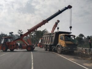 गिट्टी से भरी हाईवा अनियंत्रित होकर पलटी।