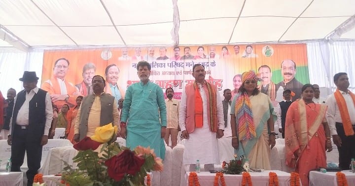 मनेंद्रगढ़ ।जिला मुख्यालय मनेंद्रगढ़ नगरपालिका परिषद के नवनिर्वाचित अध्यक्ष और 22 पार्षदों का कृषि मंत्री रामविचार नेताम की उपस्थिति में हुआ शपथ ग्रहण।शपथ ग्रहण समारोह का आयोजन मनेंद्रगढ़ सब्जी मंडी नपा कार्यालय के समीप हुआ। मनेंद्रगढ़ में भाजपा से प्रतिमा यादव अध्यक्ष पद के लिए ली शपथ साथ ही भाजपा के 10 और कांग्रेस के 9 पार्षदों के साथ तीन निर्दलीय पार्षदों ने भी लिये शपथ। शपथ ग्रहण समारोह के अति विशिष्ट अतिथि के रूप में स्वास्थ्य मंत्री श्याम बिहारी जायसवाल मौजूद रहे। कार्यक्रम के अध्यक्ष खाद्य मंत्री किरण सिंह देव और विशिष्ट अतिथि के रूप में भरतपुर सोनहत विधायक रेणुका सिंह, बैकुंठपुर विधायक भैया लाल रजवाड़े, जिला अध्यक्ष चंपा देवी पावले, पूर्व अध्यक्ष योग आयोग संजय अग्रवाल समारोह में शामिल रहे।